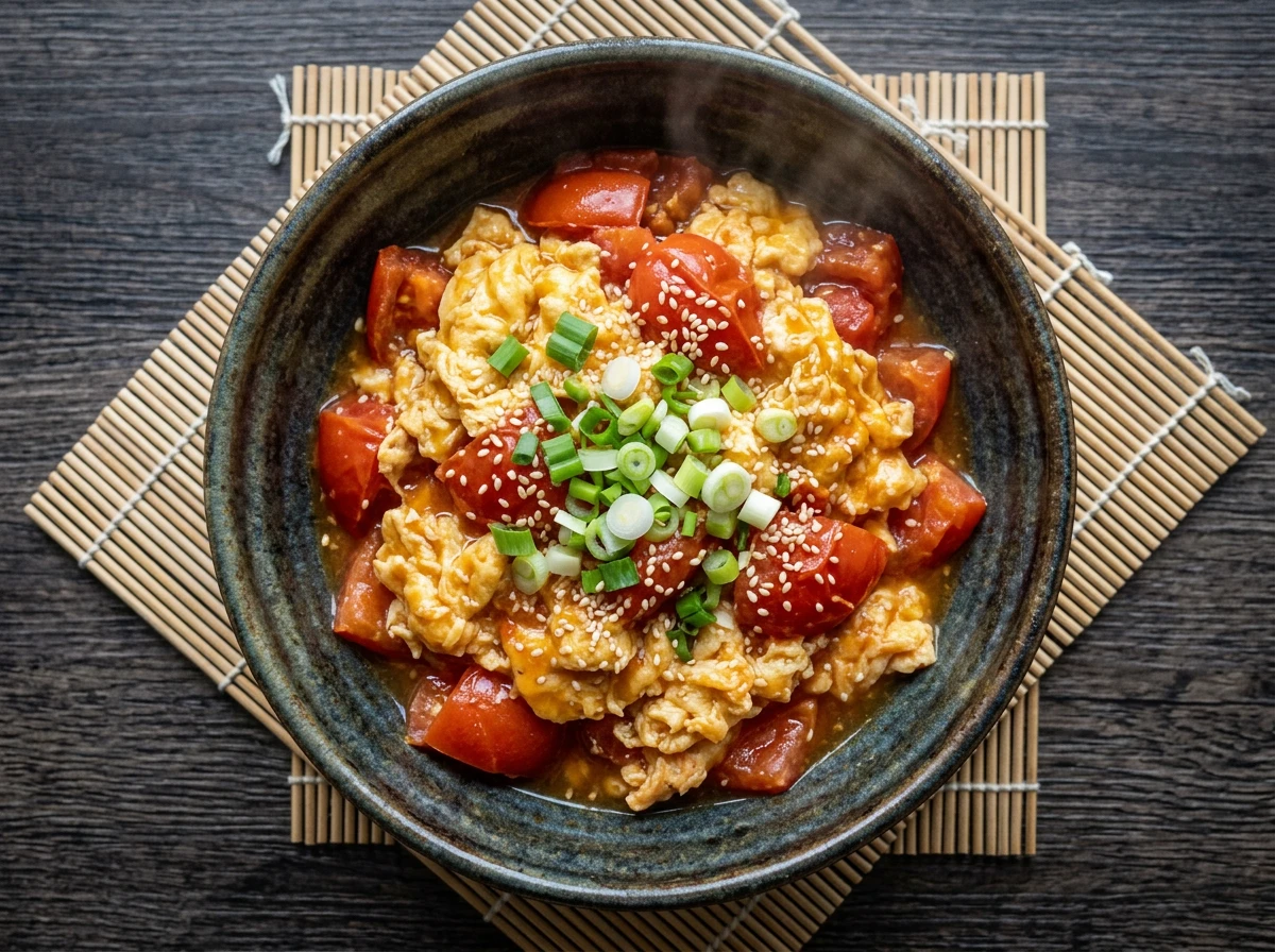 - In die Pfanne 1 TL Sesamöl geben, die vorbereiteten Tomaten hinzufügen und bei mittlerer Hitze unter Rühren ca. 3 Minuten braten, bis sie weich sind, aber noch Form haben.