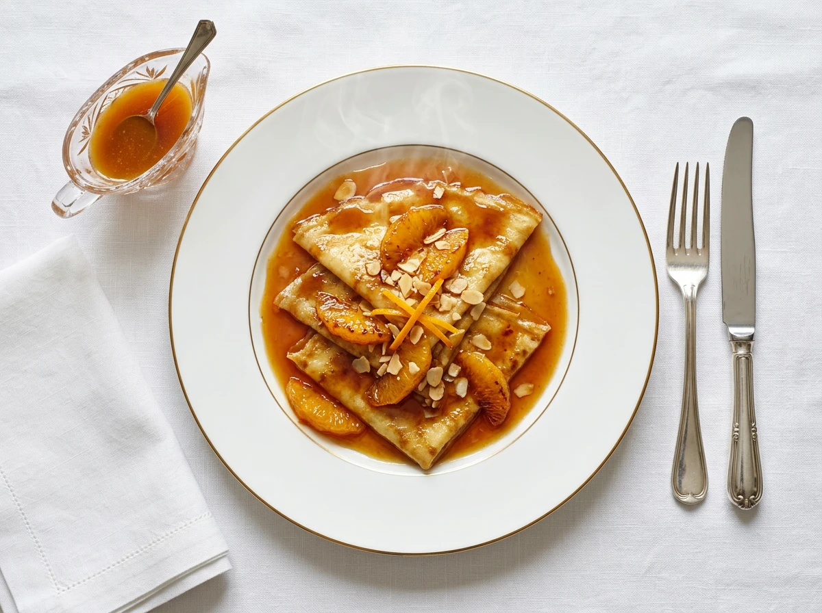 - Jeweils einen Crêpe auf die Pfanne legen, mit etwas Soße begießen, den Crêpe zweimal falten (z. B. zu einem Dreieck) und in der Soße erwärmen. Optional: Mit einem Schuss Curaçao flambieren (Flambieren nur, wenn sicher durchgeführt).