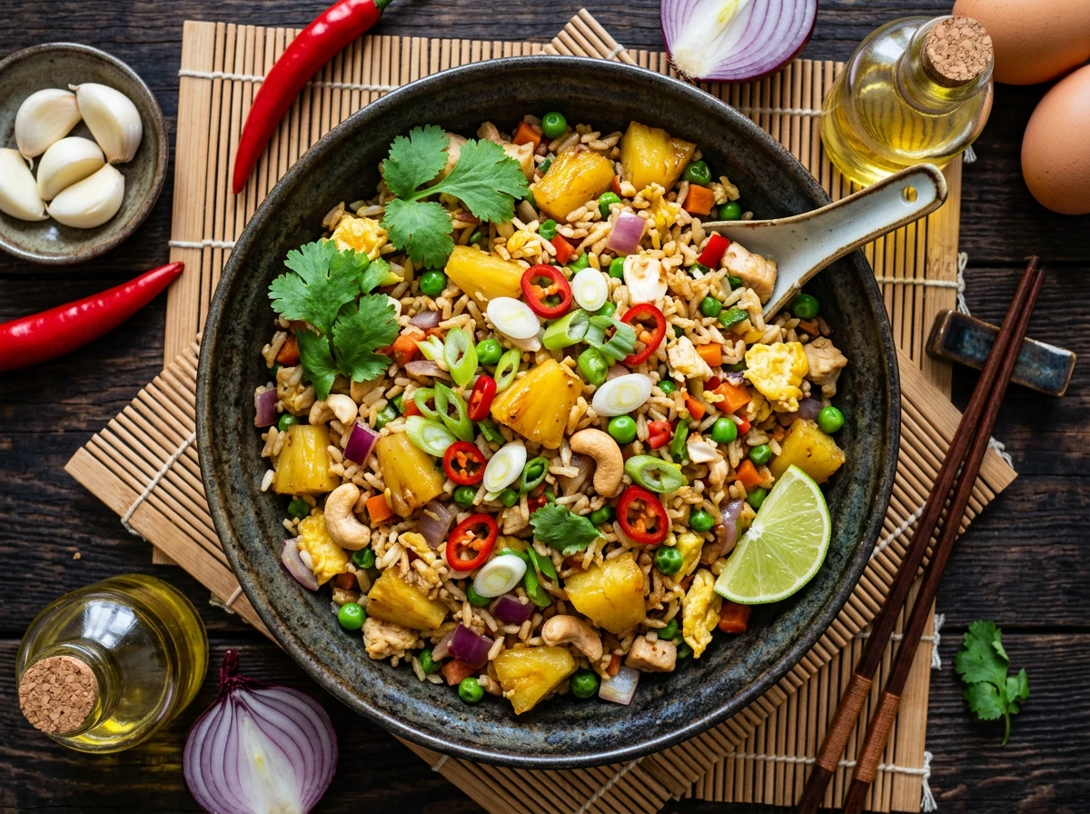 - Den heißen Reis, den in Stücke geschnittenen Bok Choy und die gewürfelte Ananas dazugeben. Alles gut vermengen und kurz erhitzen, bis alles gleichmäßig heiß ist.