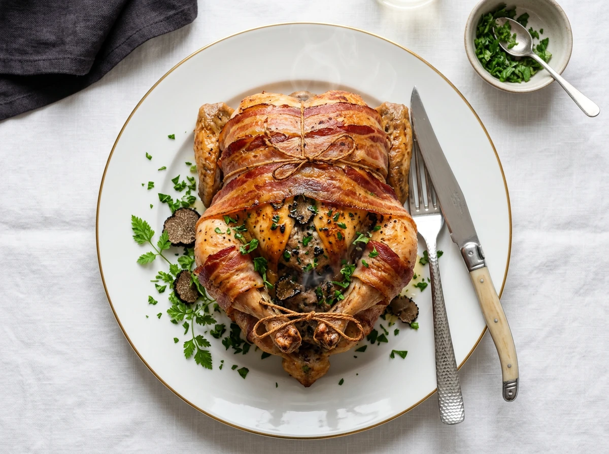 - Die Brust des Hähnchens mit dünnen Scheiben Bauchspeck (Barderstreifen) belegen, so dass die Brust bedeckt ist.