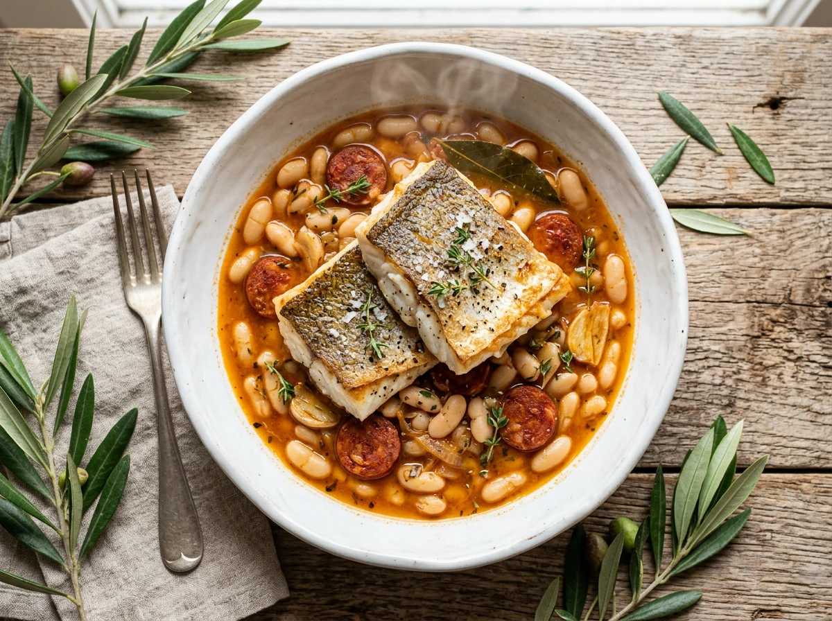 In der Pfanne gebratener Seehecht mit weißen Bohnen & Chorizo-Brühe