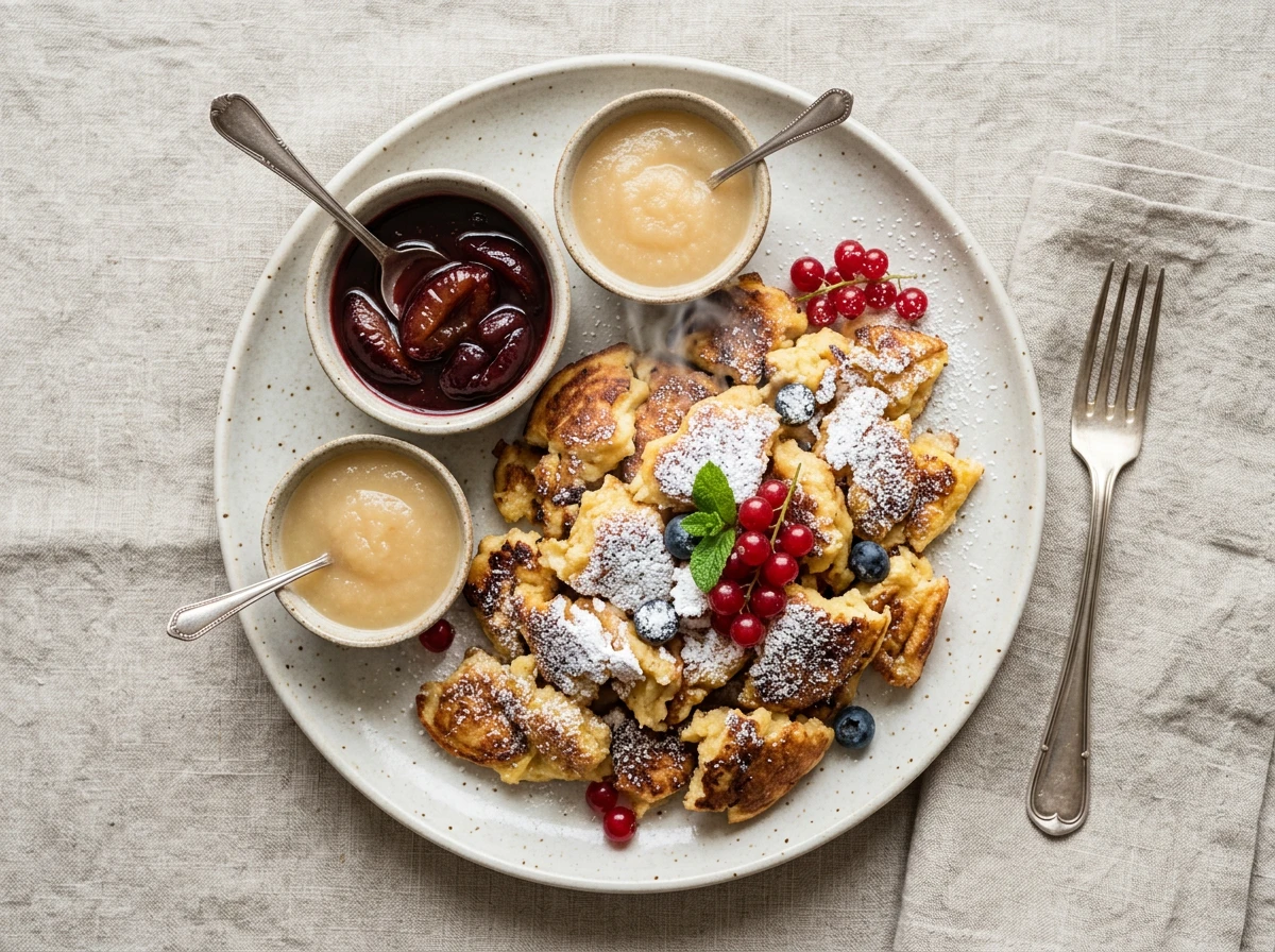 - Kaiserschmarrn auf Teller verteilen, großzügig mit Puderzucker bestäuben und sofort servieren.