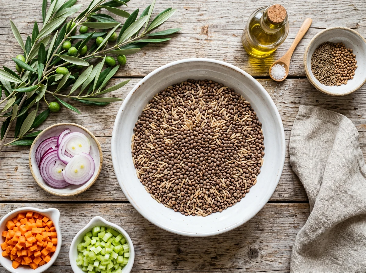 - Aufkochen, dann zudecken und bei kleiner Hitze 40–60 Minuten köcheln lassen. Zwischendurch prüfen und bei Bedarf etwas Wasser ergänzen. Das Gericht ist fertig, wenn Reis und Linsen weich sind, aber noch etwas Flüssigkeit vorhanden ist (nicht suppig).