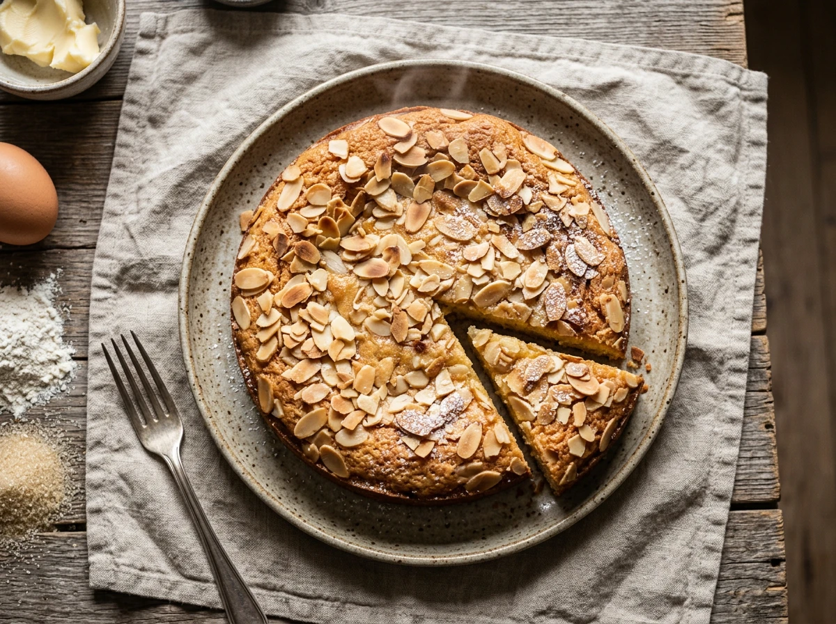 - Die geschnittenen Mandeln mit dem zurückbehaltenen Zucker (ca. 30 g) und dem Zimt mischen und gleichmäßig auf dem Teig verteilen.
