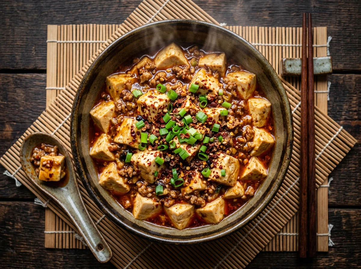 - Mapo Tofu über dem Reis anrichten und heiß servieren.
