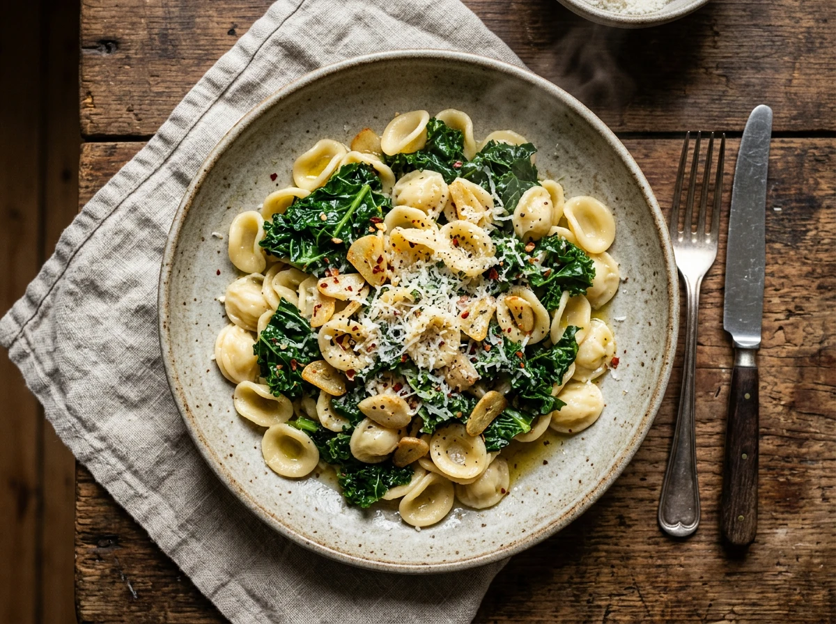- Die Pasta mit einer Zange direkt aus dem Wasser in die Pfanne mit dem Grünkohl heben (etwas Kochwasser kann mitkommen).