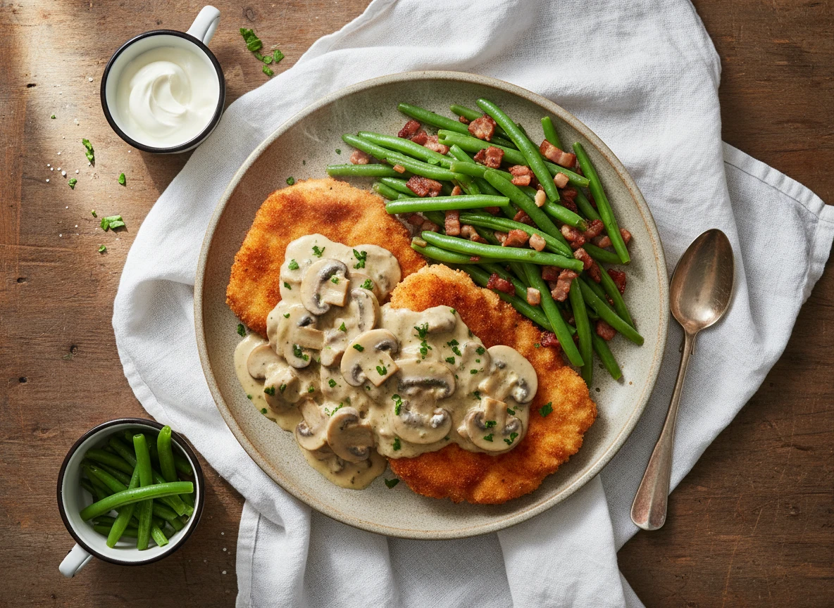 Schweineschnitzel in Rahmchampignon-Sauce mit Speckbohnen