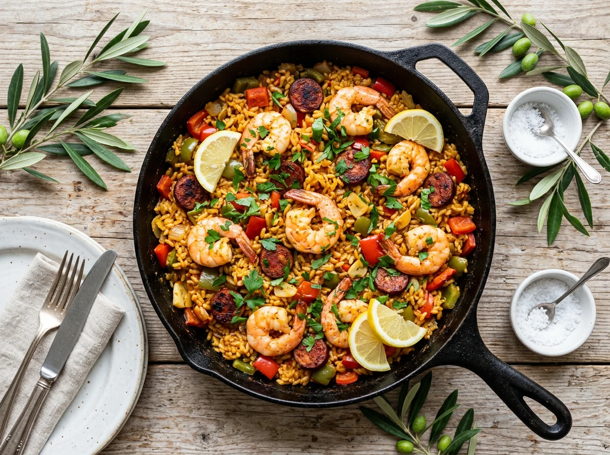 Spanischer Reis mit Garnelen aus einer Pfanne