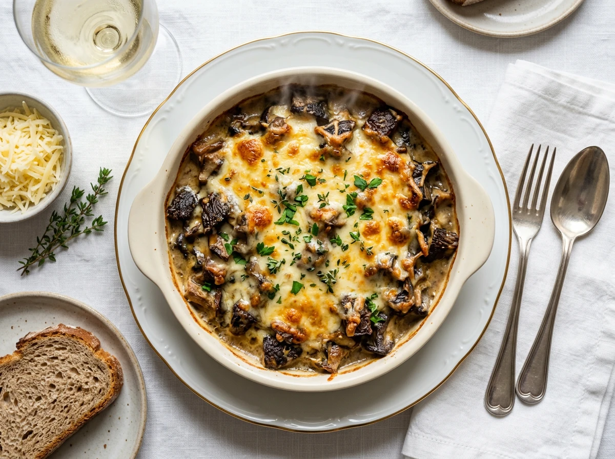 - Jeweils etwa 150 g der angebratenen Pilze in ofenfeste Förmchen (Ramekins) oder eine flache ofenfeste Form geben.
