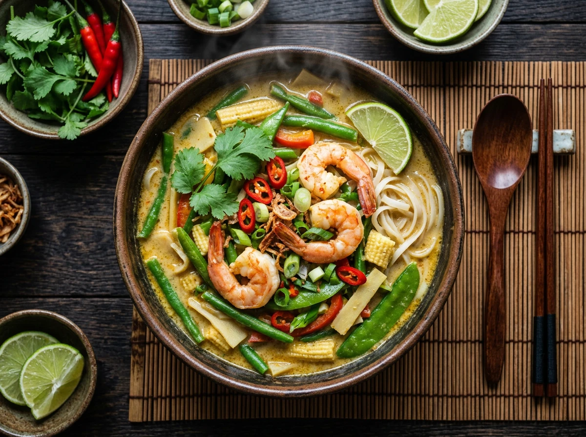 - Kokosmilch, Gemüsebrühe und Udon‑Nudeln in den Topf geben. Kurz aufkochen, dann die Hitze reduzieren und 5 Minuten köcheln lassen, bis die Nudeln gar und das Gemüse zart, aber noch bissfest ist.