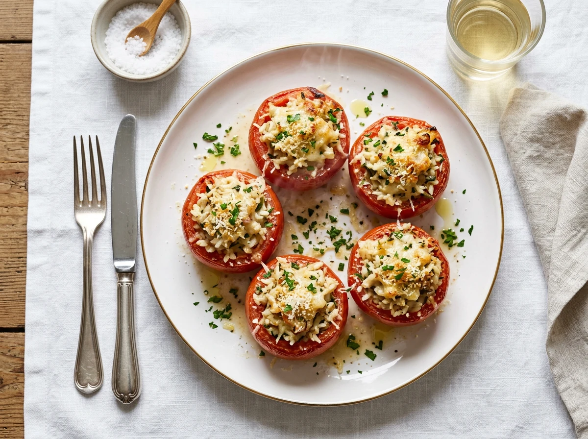 - Die Tomaten auf vorgewärmten Tellern anrichten, mit etwas gehackter Petersilie bestreuen und sofort servieren.