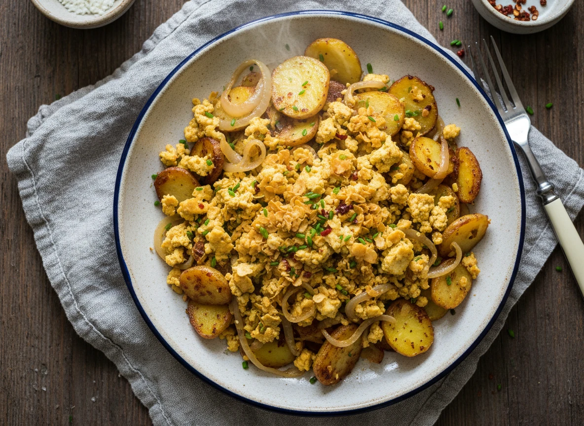 Veganer Rührtofu Mit Bratkartoffeln Und Zwiebeln