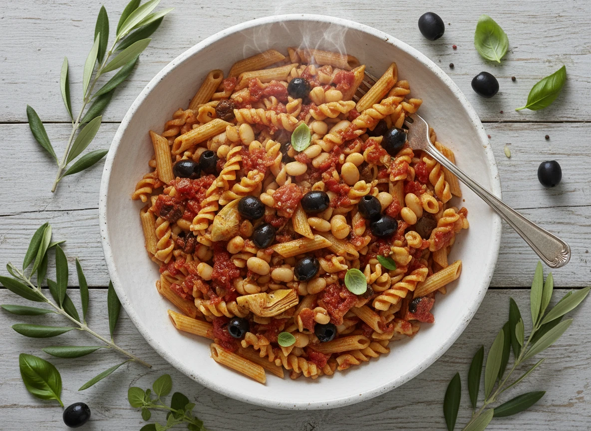 Vollkorn-Penne mit Cannellini-Bohnen, Artischocken und Tomaten-Oliven-Sauce