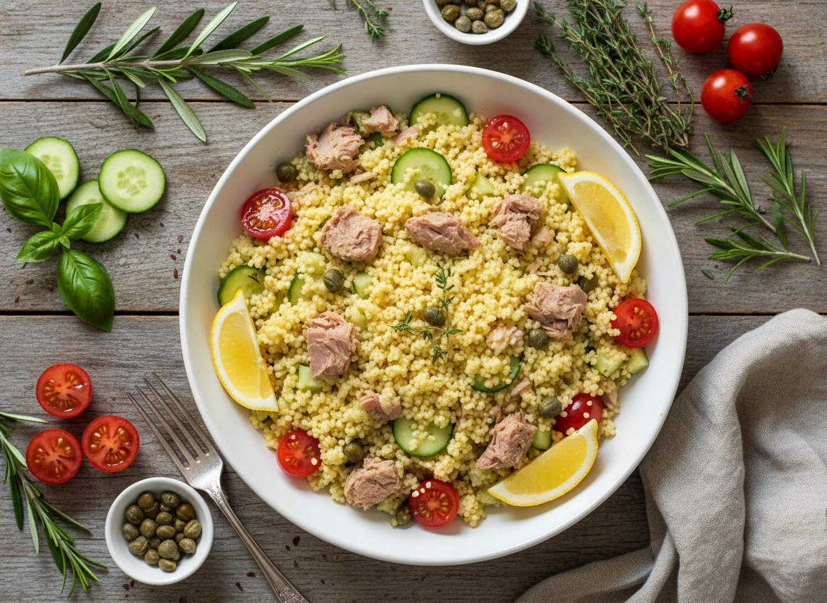 Zitroniger Couscous Salat Mit Thunfisch, Gurke Und Kapern