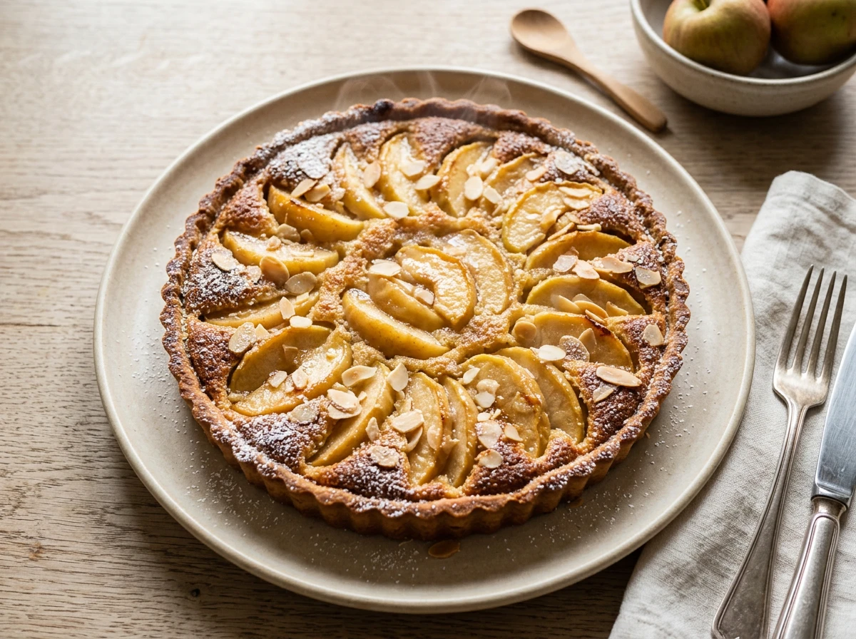 - Aus dem Ofen nehmen, 15 Minuten abkühlen lassen und dann den Tarte-Ring entfernen. Warm servieren (z. B. mit Sahne, Crème fraîche oder Vanilleeis).