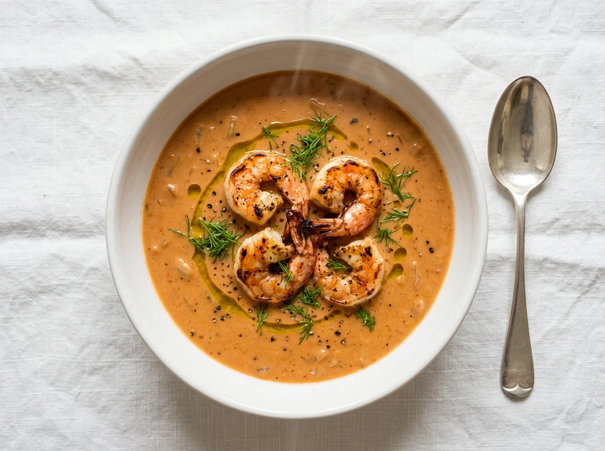 - Versez la bisque dans des bols, déposez les crevettes dessus et parsemez d'aneth ou de pluches de fenouil.