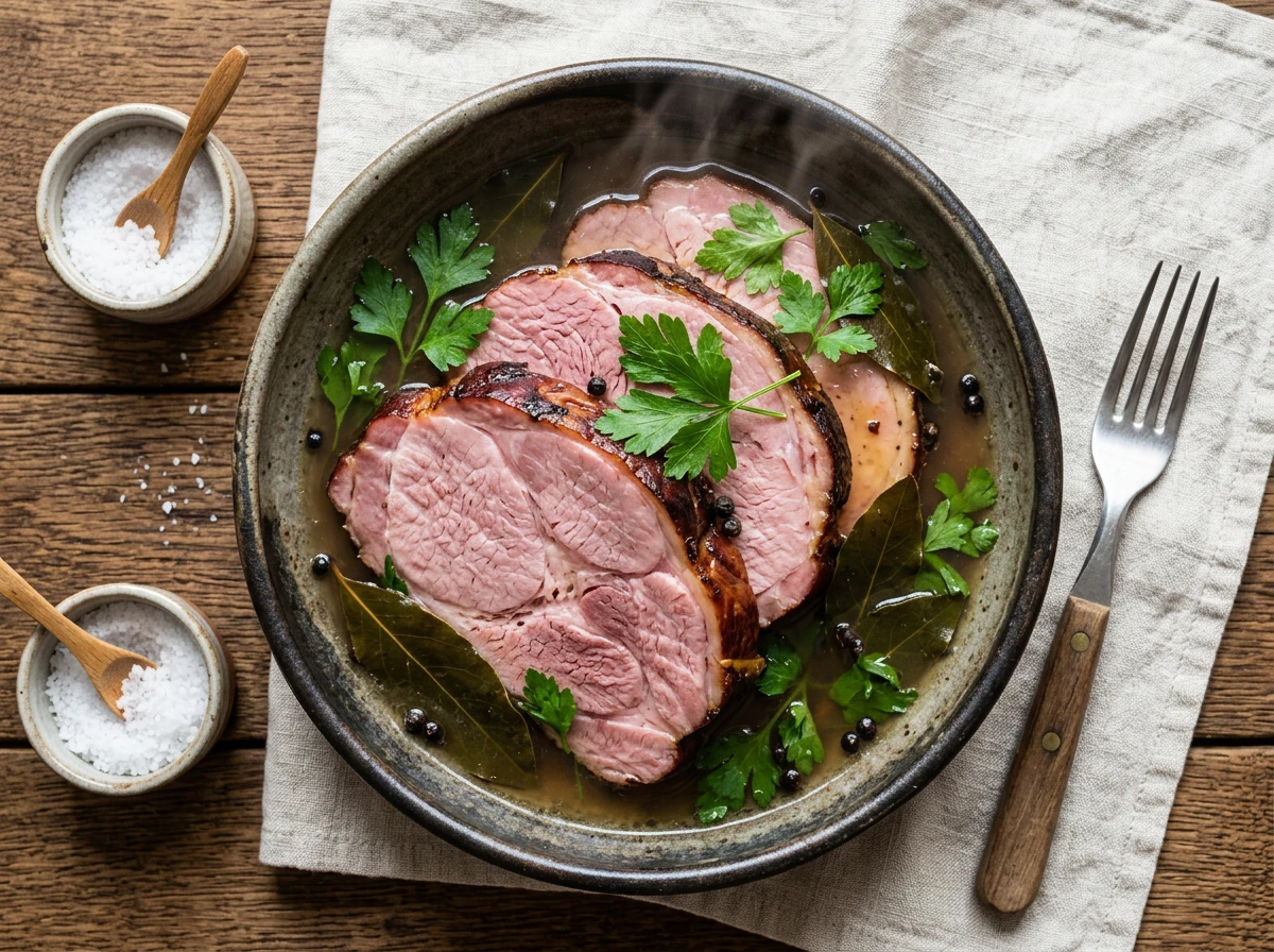 - Après 3½ heures, couvrir hermétiquement et laisser reposer le jambon 30 minutes supplémentaires dans le bouillon chaud (environ 4 heures au total).