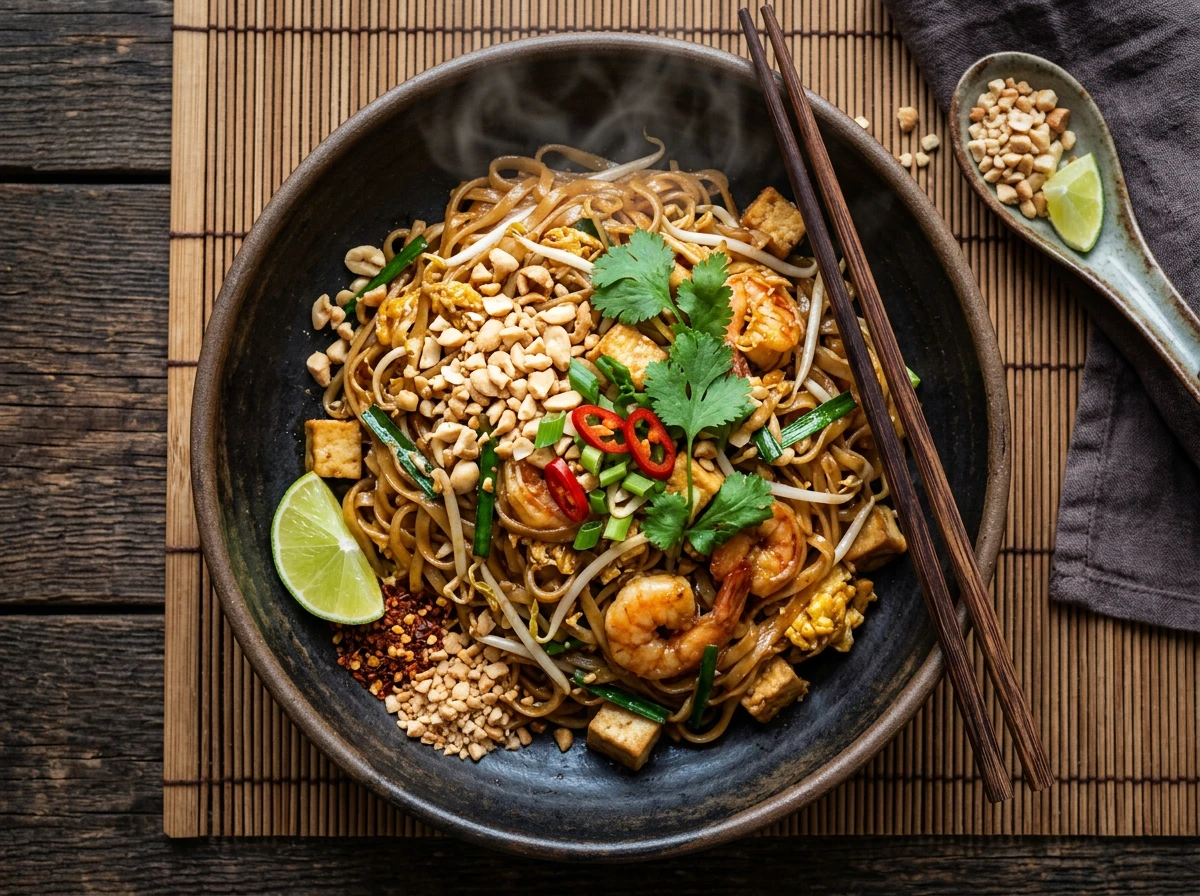 - Placer sur un grand plat, parsemer du reste des cacahuètes et de la coriandre et servir avec des quartiers de citron vert et la sauce chili douce.
