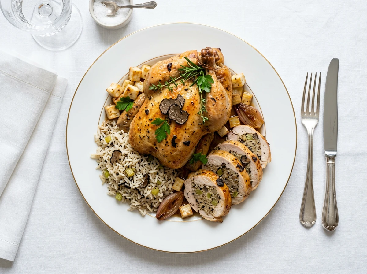 - Trancher ou disposer la poularde entière sur un plat ovale préchauffé.
