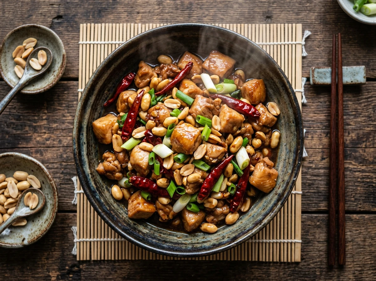 - Ajoutez les oignons nouveaux, l'ail, les châtaignes d'eau et les cacahuètes à la sauce.