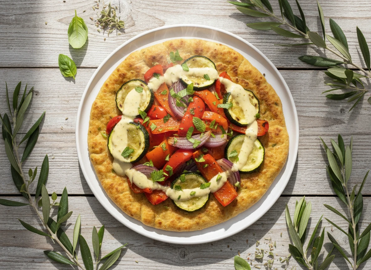 Socca de pois chiches avec légumes rôtis et tahini au citron