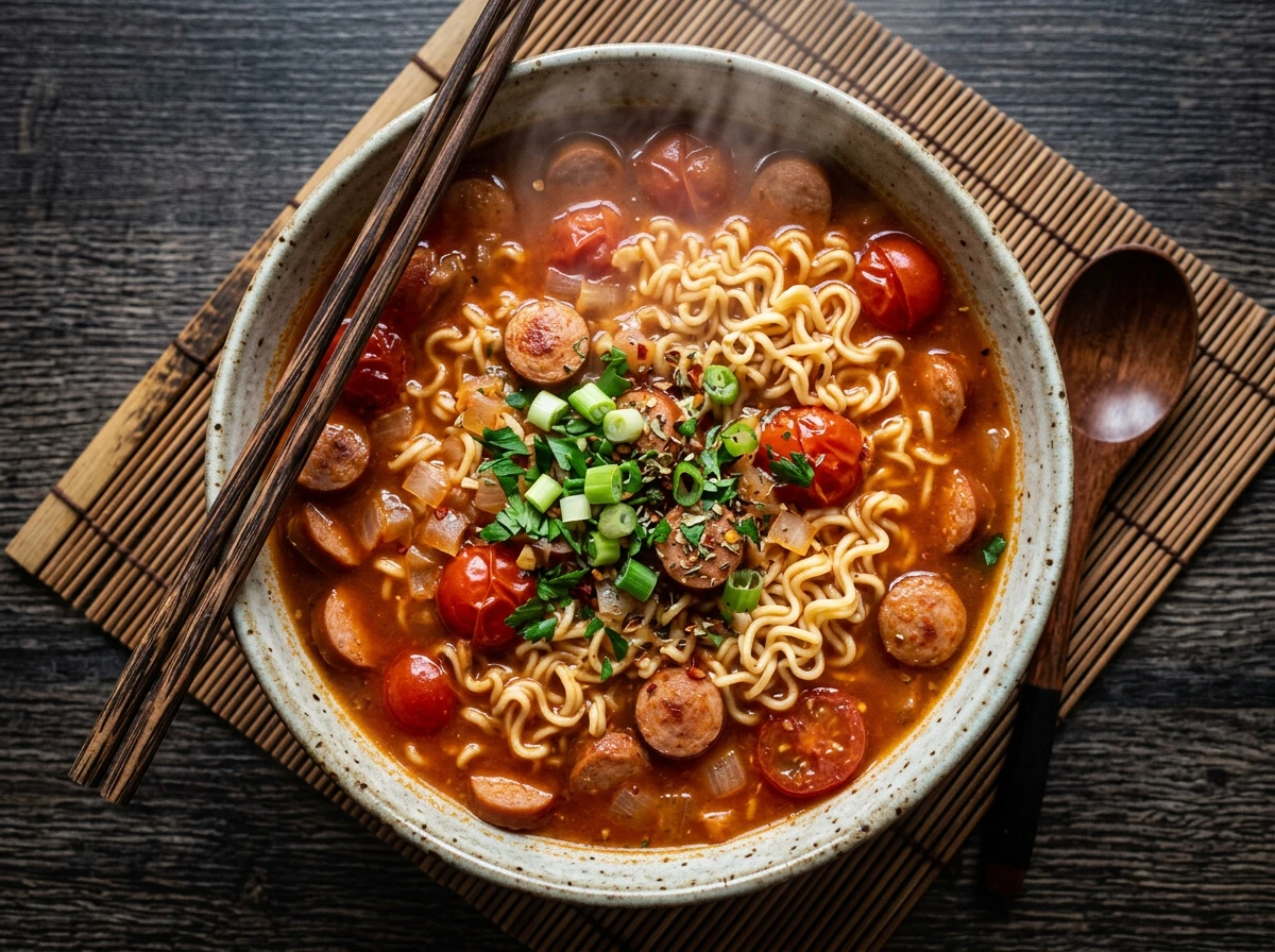 - Ajouter les tomates en dés et les tranches de saucisse, cuire 5 minutes.