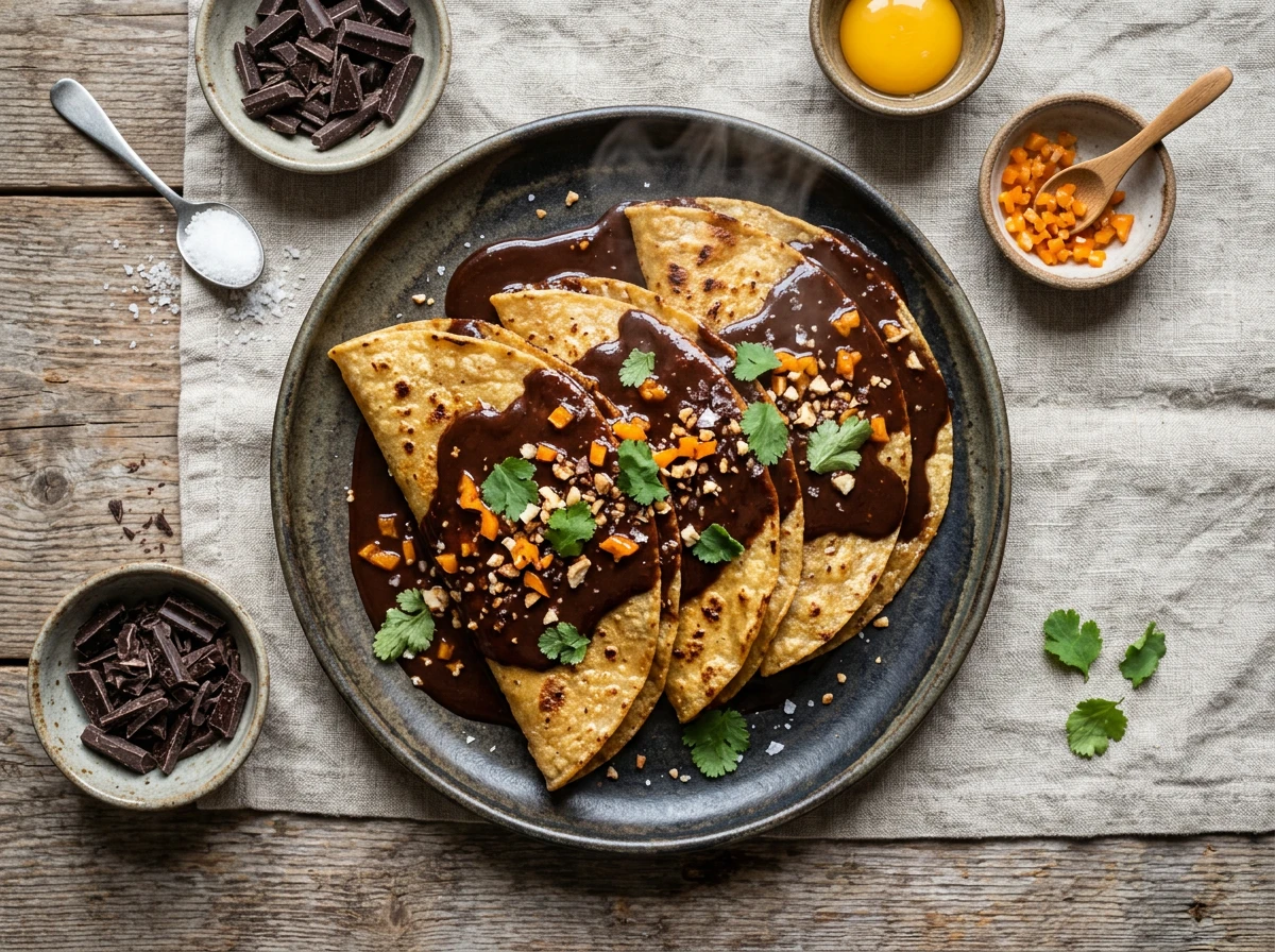 - Nappez les quartiers de tortilla cuits avec la sauce chaude et servez immédiatement.