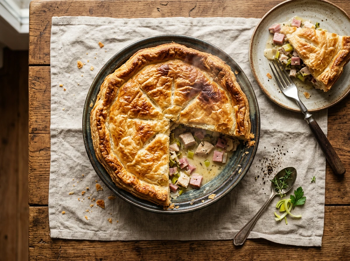 Tourte au poulet, jambon et poireau