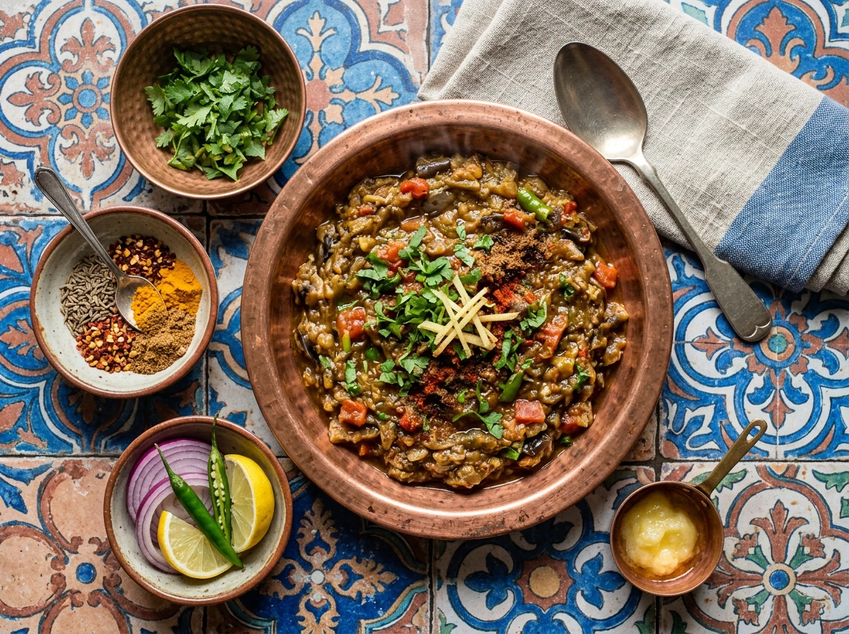 - Add the chopped/mashed roasted eggplant and mix well with the onion-tomato masala.