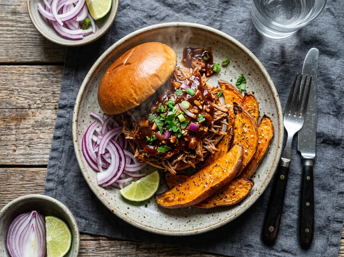 - Fill buns with BBQ pork, top with pickled onion and hot sauce. Serve with sweet potato wedges.