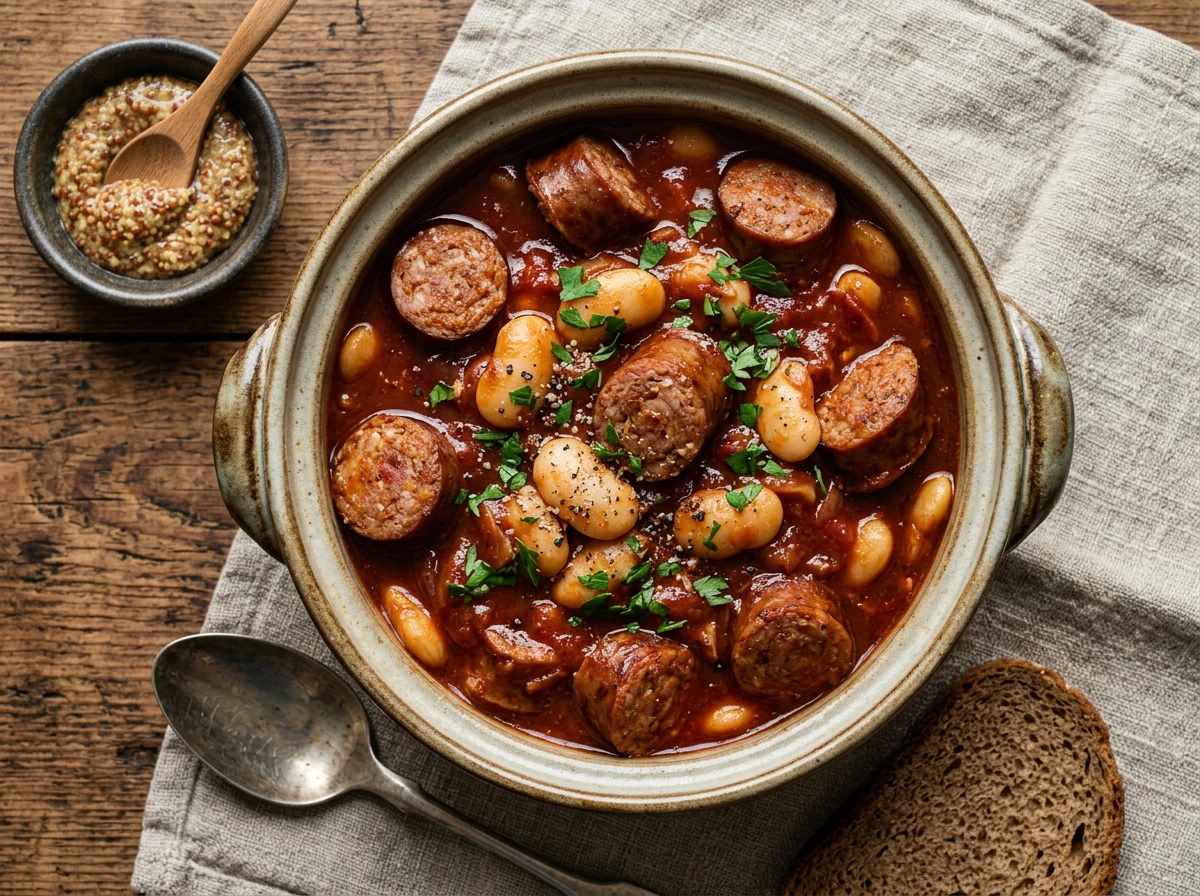 - Add the drained butter beans, 1 tbsp black treacle (or 1 tbsp brown sugar) and 1 tsp English mustard, stirring well.