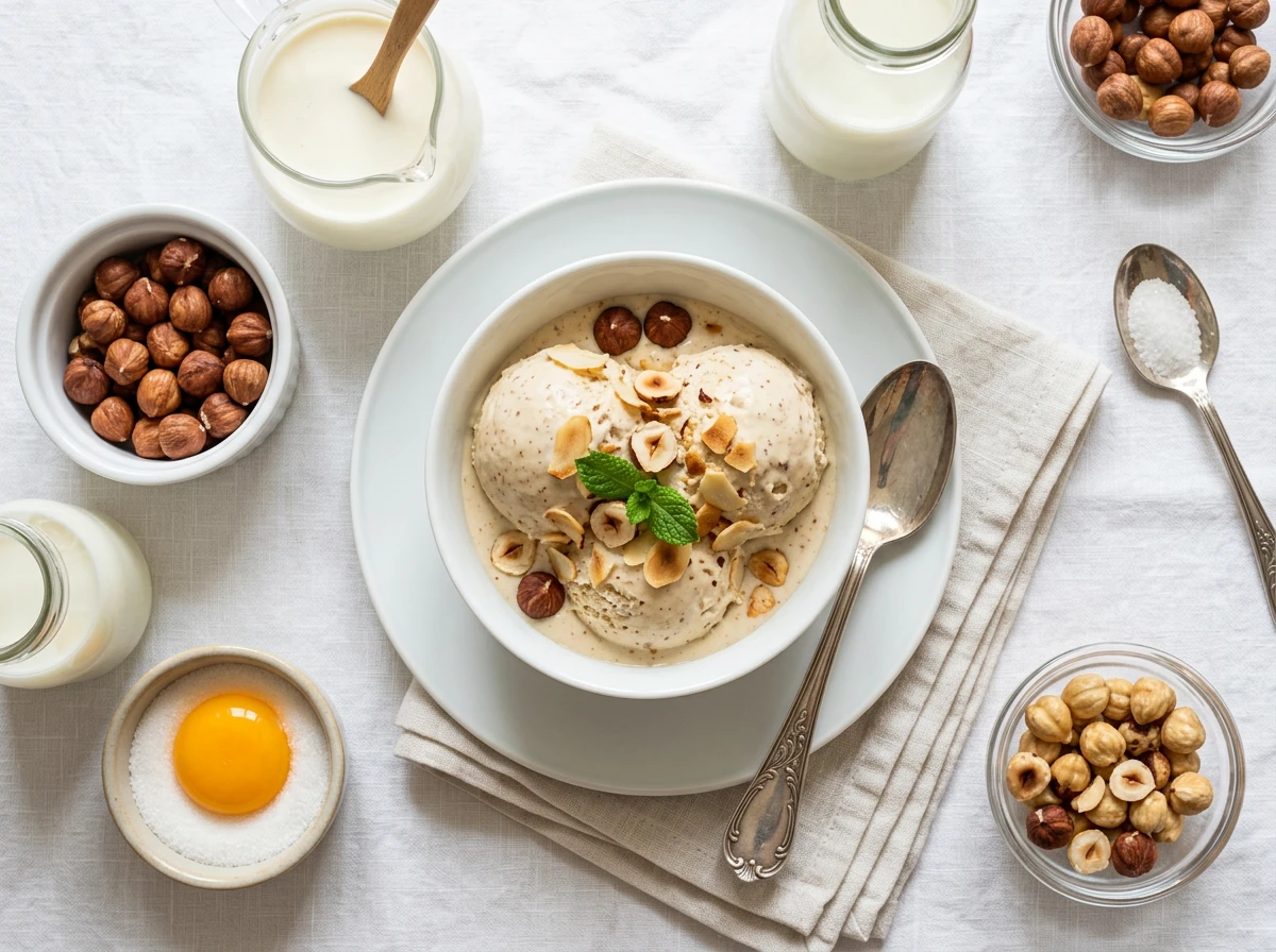 - Bring 1 L milk to a boil in a saucepan. Remove from heat, stir in the hazelnut paste and let steep for 20 minutes with the heat off, covered.