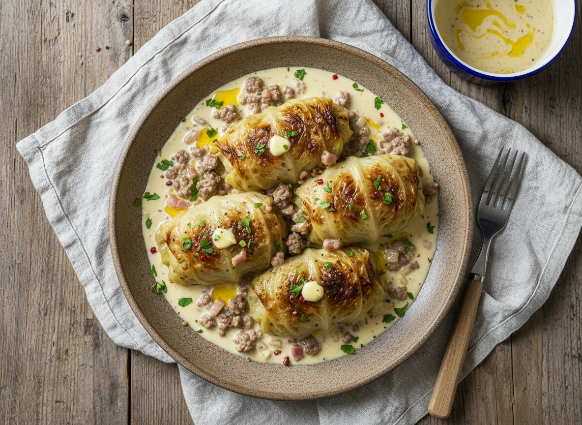 Keto Cabbage Rolls with Minced Meat in Bacon Cream Sauce