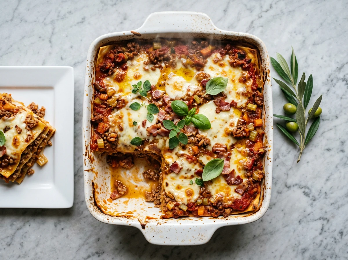 - Place two lasagna sheets overlapping on the sauce, add more ragù and repeat to create 3–4 layers, finishing with a pasta layer.