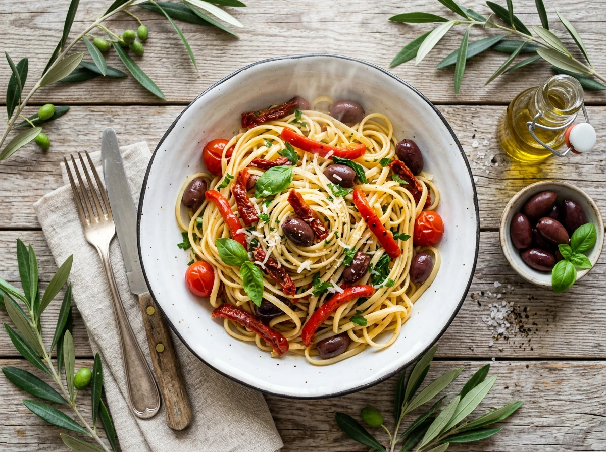 - Stir in roasted red peppers, sun-dried tomatoes, pitted Kalamata olives and the artichoke heart.