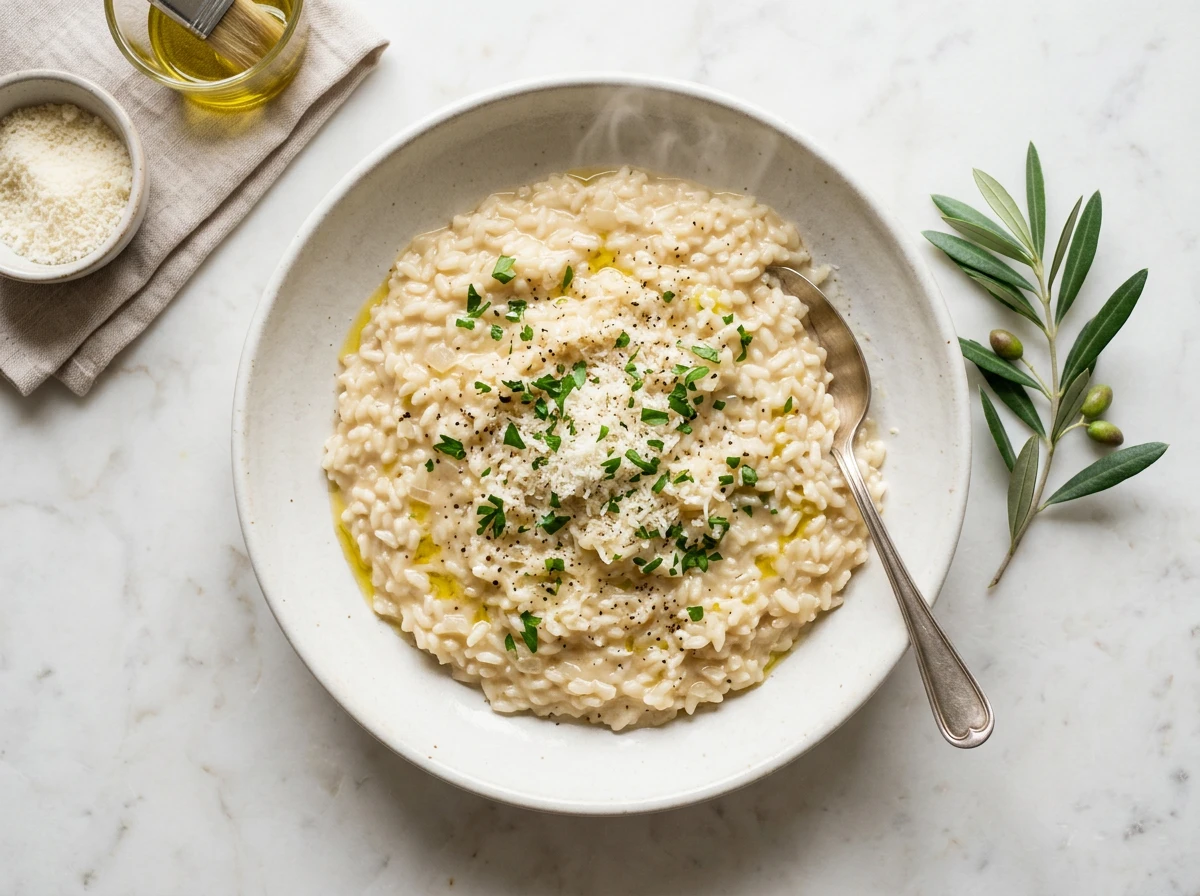- Stir in the remaining butter (about 15 g) in small pieces vigorously until the risotto becomes creamy and glossy (mantecatura).