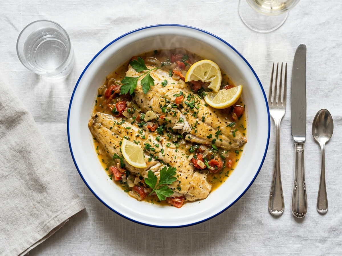 - After cooking, whisk about 60 g of butter into the cooking liquid to emulsify and pour the sauce over the fish.