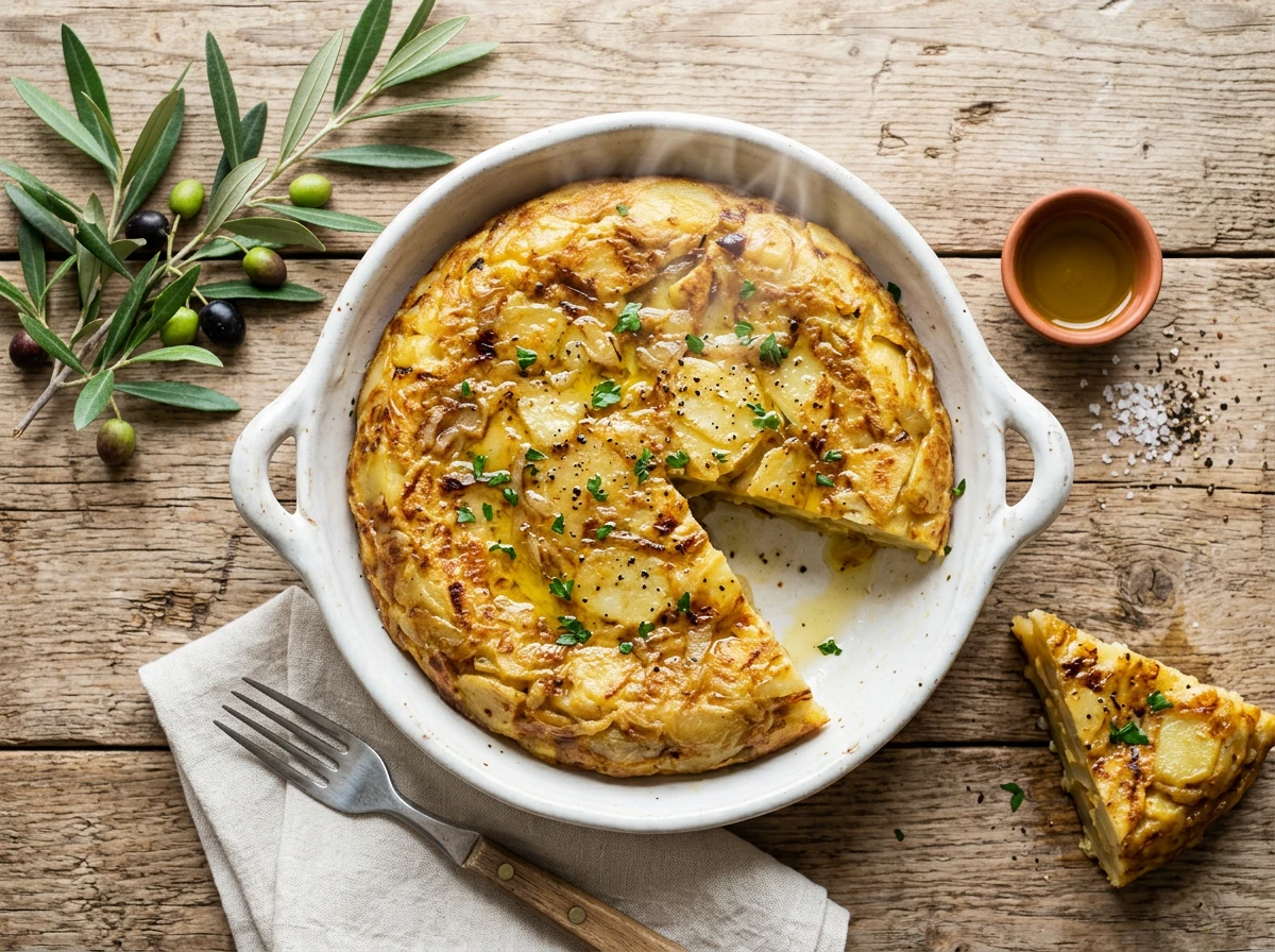 - Beat the eggs, season lightly and pour over the potato-onion mixture. Replace the lid and cook gently for about 20 minutes, until the edges and base are golden and the top is almost set but still slightly wobbly.