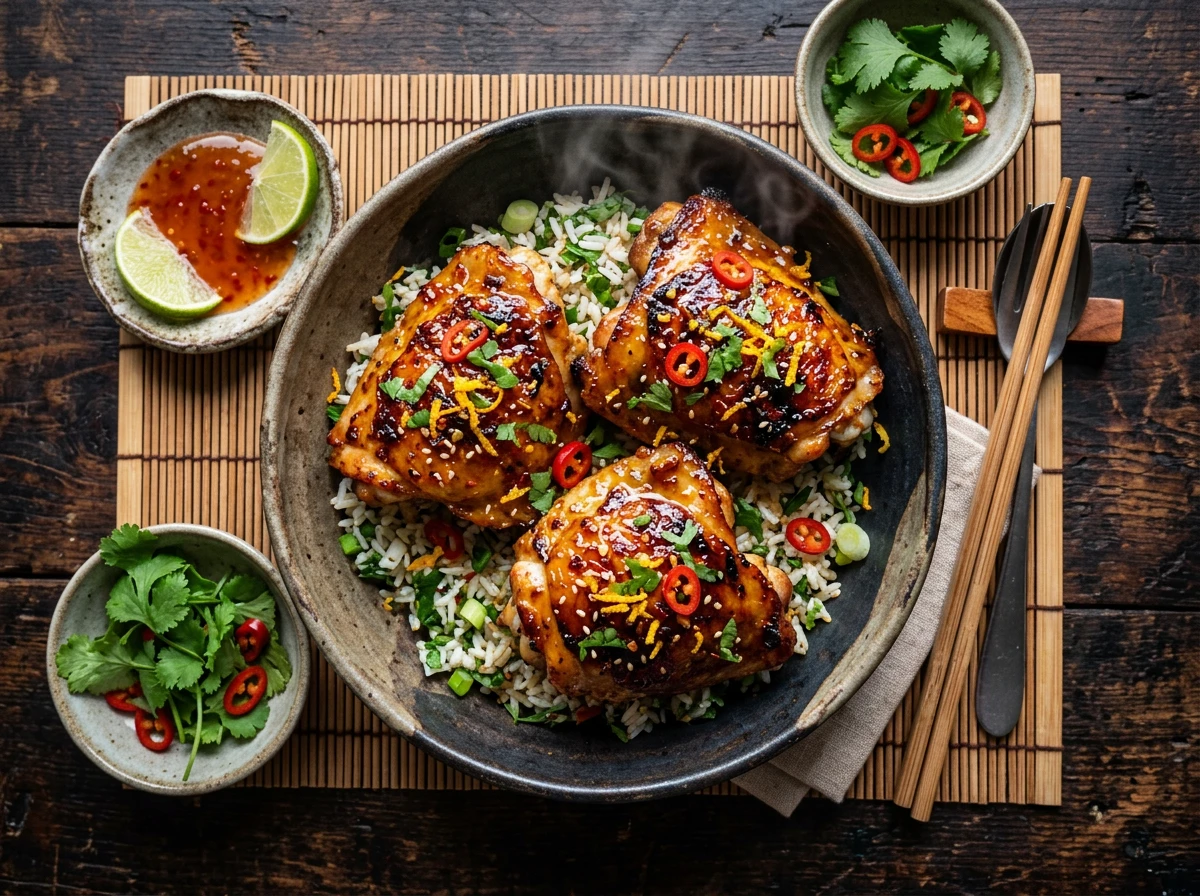 - Mix the sweet chilli sauce with the orange zest and juice, crushed garlic, red Thai curry paste and 1.5 g salt in a large bowl.